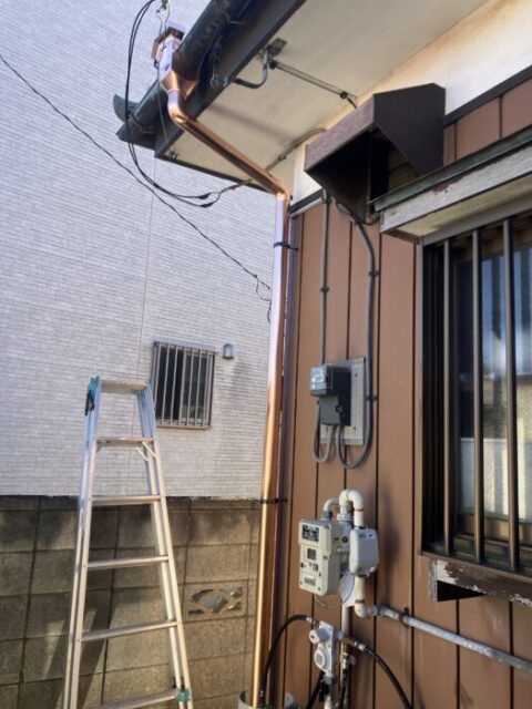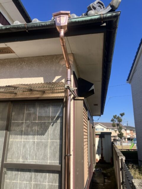 銅雨樋は、最近の新築工事ではなかなか使われることはありません。10円玉のように新品の時はピカピカに光っていますが、数か月たつと徐々に茶色に代わっていき、数年後には緑青色になっていきます。この色の変化は銅板の持つ独特の美しさであります。